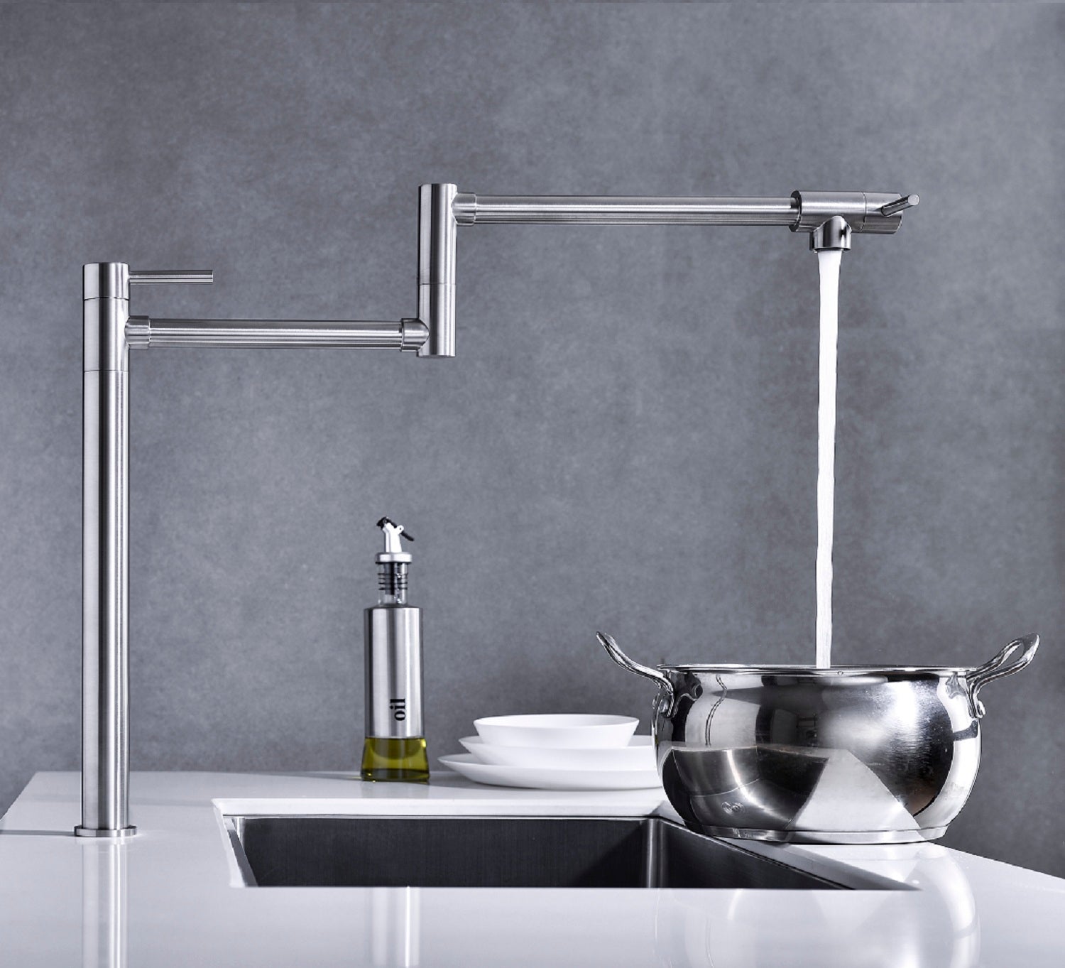 • The pot filler faucet features a free-swivel arm design, making it easier to fill any pot on the stovetop and for easier cleaning.